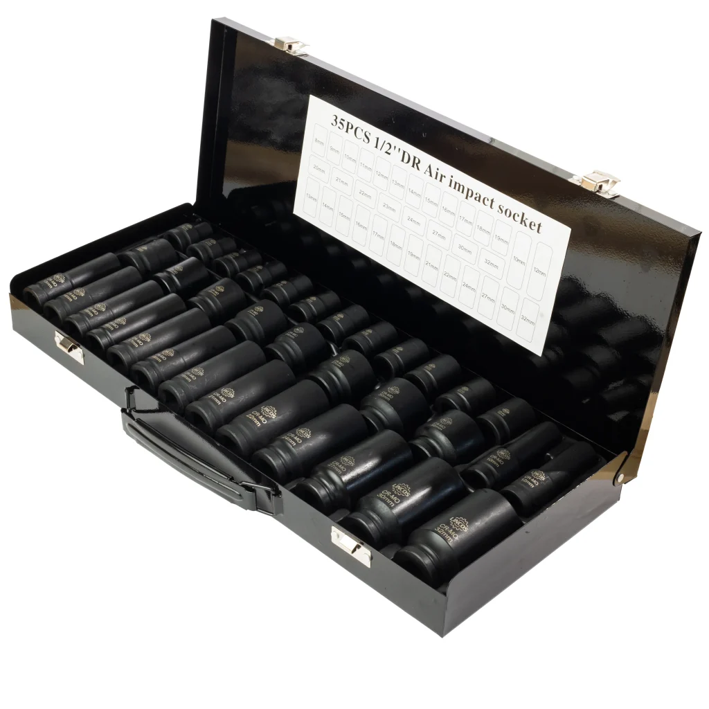 Този 35-частен комплект 1/2″ ударни накрайници включва както дълбоки, така и къси накрайници, предоставяйки пълен набор от размери за автомобилни и индустриални приложения. Изработени за работа с ударни инструменти, всеки накрайник е проектиран да издържа на високи въртящи моменти и тежки условия на работа.