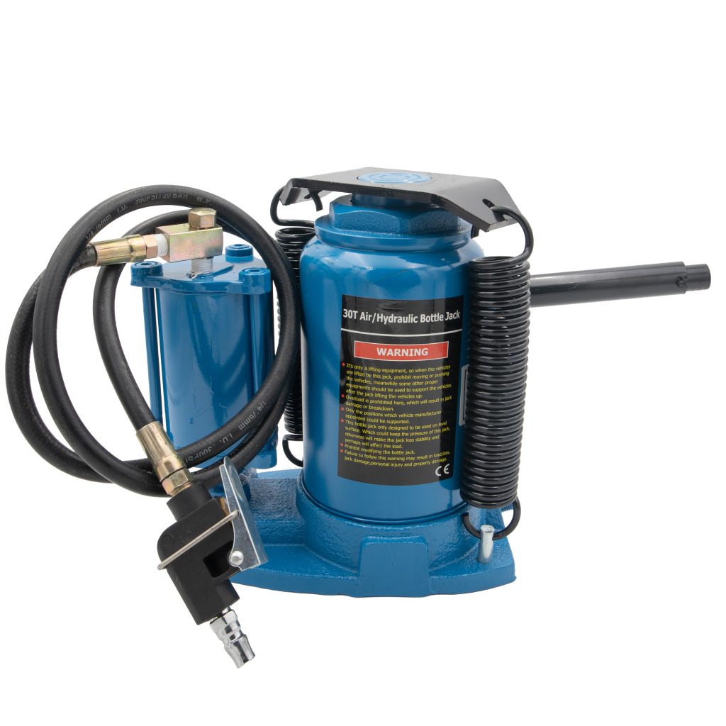Този 30-тонен въздушно-хидравличен бутилков крик е създаден за взискателни задачи по повдигане, свързани с тежкотоварни превозни средства и индустриални машини. Благодарение на въздушно подпомагания хидравличен механизъм, той осигурява мощно повдигане с минимални физически усилия, докато включената ръчна помпа гарантира пълен контрол, когато няма наличен сгъстен въздух.