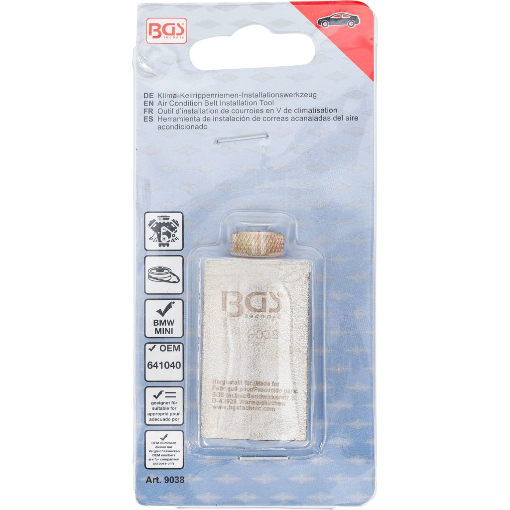 Инструментът за монтаж на ремъка на климатичната система за BMW N62 / MINI W17 е проектиран специално за инсталиране на ремъци с еластичен привод—тип ремък, който се използва без натягач. Този инструмент позволява безопасно и правилно поставяне на ремъка на климатичната система на избрани двигатели на BMW и MINI.