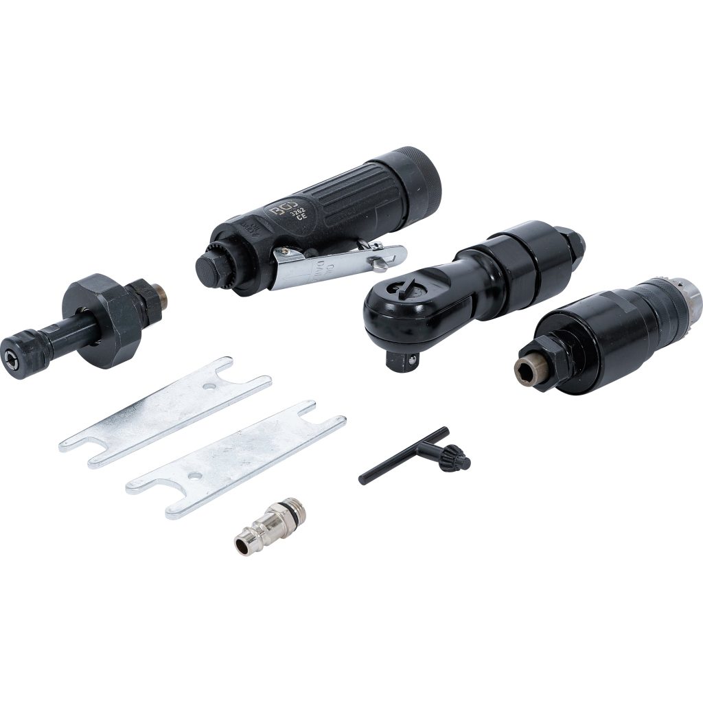 Мултифункционалният въздушен инструмент с 3 сменяеми работни глави е универсално решение за професионалисти, които се нуждаят от гъвкавост в компактен формат. Със своята система за бързо освобождаване, преминаването между главите за шлайфане, тресчотка и пробиване става бързо и ефективно, значително спестявайки време по време на работа.