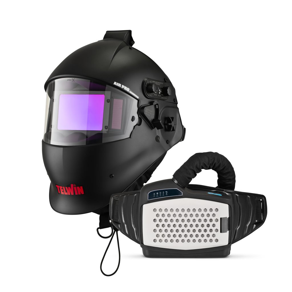 - Автоматичен шлем със захранван пречистващ въздуха респиратор (PAPR) за индустриална употреба Telwin Air Pro Grandview, подходящ за всички видове MMA, MIG-MAG и TIG (>2A) заваряване.