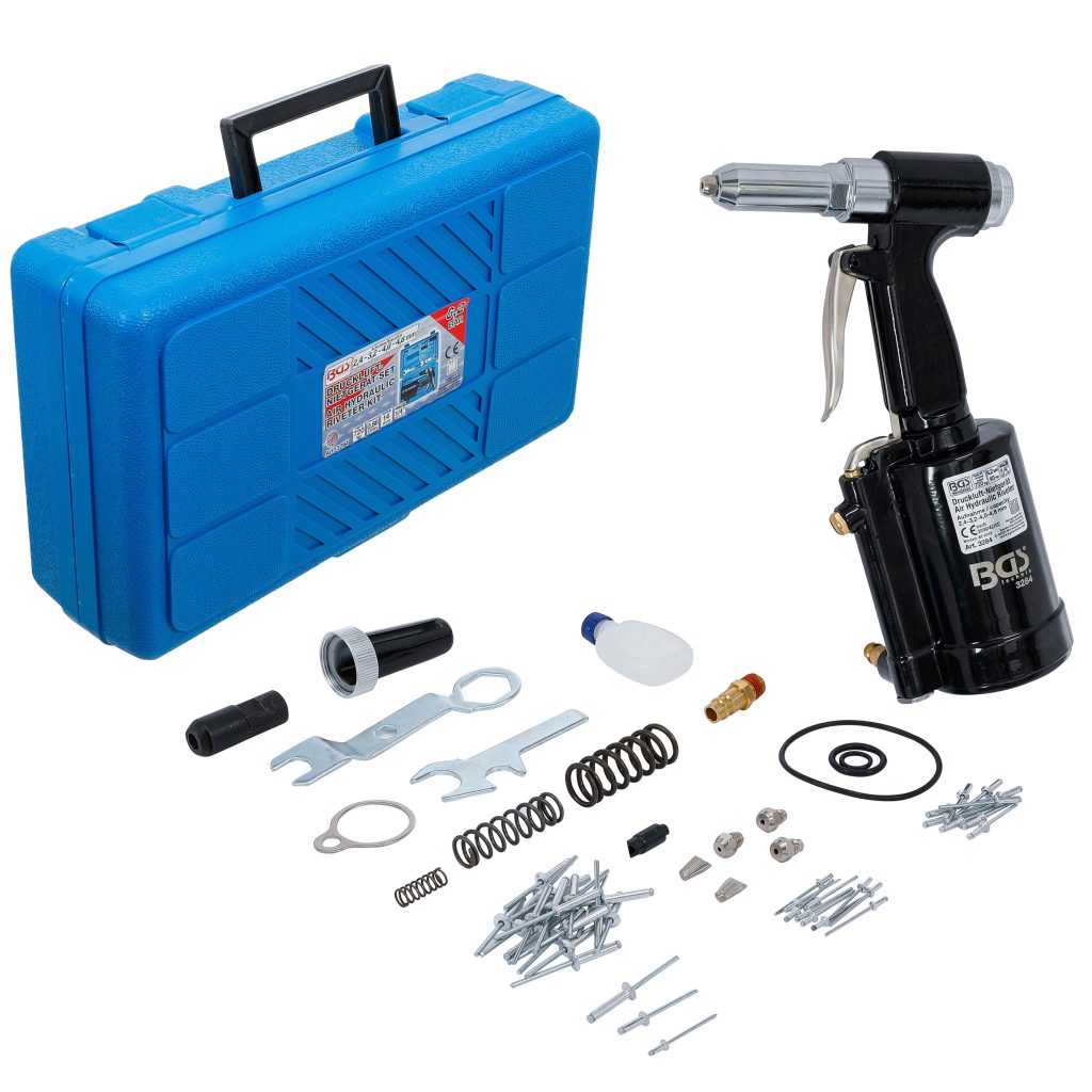 Този пневматичен нитач е мощен и ефективен инструмент, предназначен за поставяне на алуминиеви нитове с размери 2.4mm, 3.2mm, 4.0mm и 4.8mm, идеален за метални конструкции, автомобилни задачи и структурни сглобки.