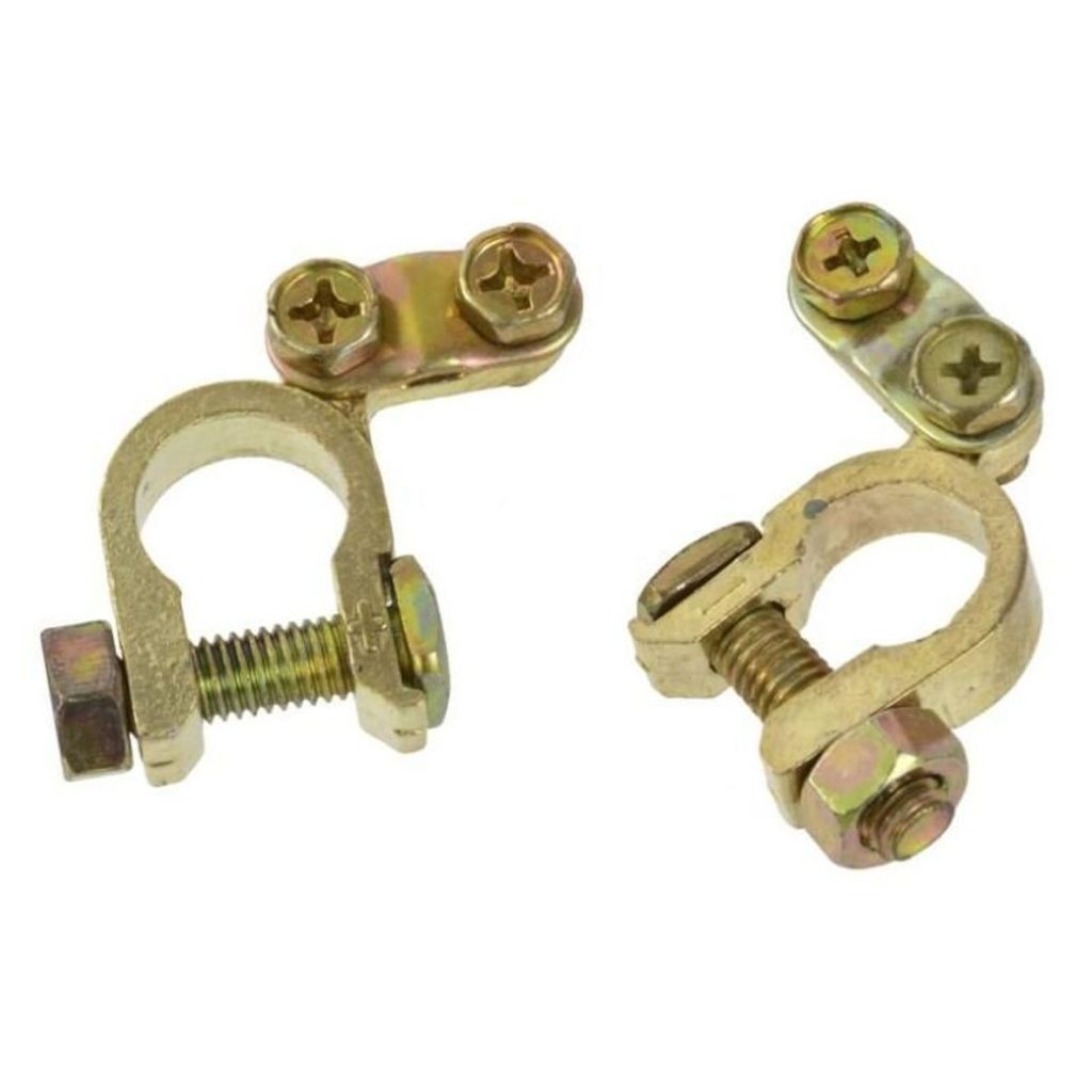 Универсален комплект за клеми на акумулатор. 2 броя. Както положителна, така и отрицателна (означени на клемата). Клемите са подходящи за 6V или 12V акумулатори. Изработени от месинг за добра проводимост. Използват се за удължаване на акумулатора, паралелно свързване и свързване към маса. Резбите вече са поставени в клемите за по-бърз монтаж. Подходящи за автомобили, превозни средства, кемпери и лодки, които имат стандартен акумулатор с горен пост (19mm положителен и 17mm отрицателен).