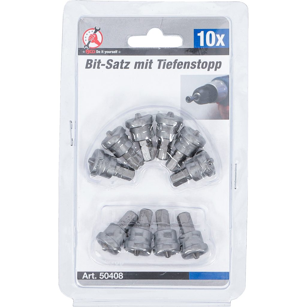 10-частов комплект битове с ограничител на дълбочината за гипсокартон, задвижване 6.3mm (1/4"), PH2 кръстат шлиц, хром-ванадиева стомана (S2).