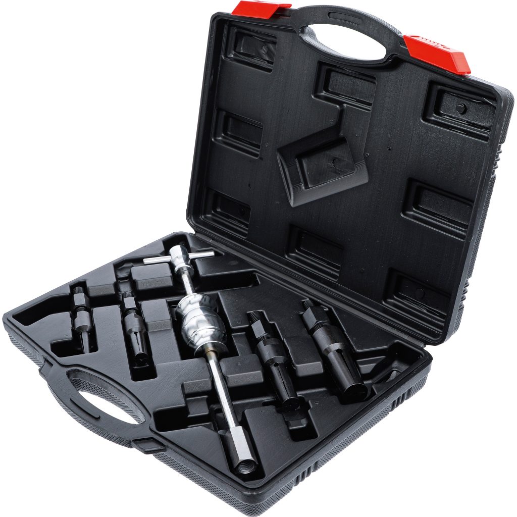 Този комплект от 5 части инструменти за изваждане на лагери от затворени отвори е проектиран за премахване на лагери, втулки, маншони и подобни компоненти, особено от затворени или слепи отвори, където конвенционалните инструменти не могат да достигнат.