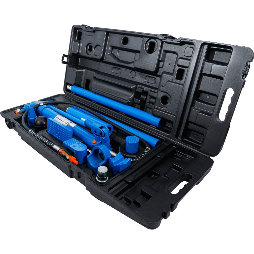 Хидравличният комплект за ремонт на каросерия и калници, 10 т е професионална система за извършване на сложни задачи по конструкциите на автомобилите, като пресоване, затягане и разширяване на повредени части. Проектиран за високо натоварване, този хидравличен комплект осигурява максимално налягане от 10 тона, което го прави подходящ за структурни ремонти, изправяне на рами и операции по преформатиране.