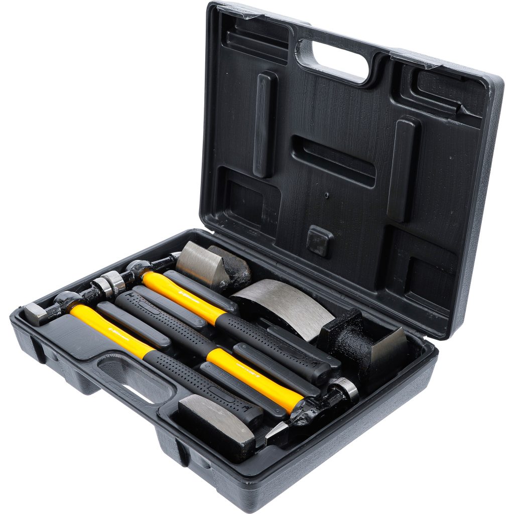 The body repair set, 7 pcs. is a practical and efficient kit for hammering, forming, and stretching car body panels. Ideal for panel beaters, restoration experts, and repair shops, this set includes three specialized hammers and four hand anvils, each tailored for different shaping tasks on automotive sheet metal.