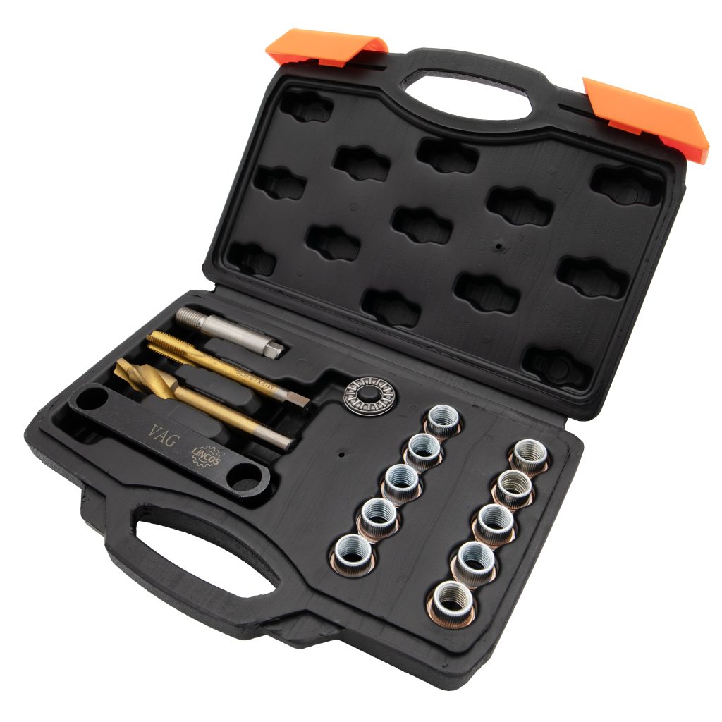 - Включва метчик M12x1.5mm за създаване на резба, стъпаловидно свредло за първоначално разширяване на отвора, локатор за вложки за точно поставяне на вложките, две шайби за гладка работа и десет резервни вложки за многократни ремонти.
