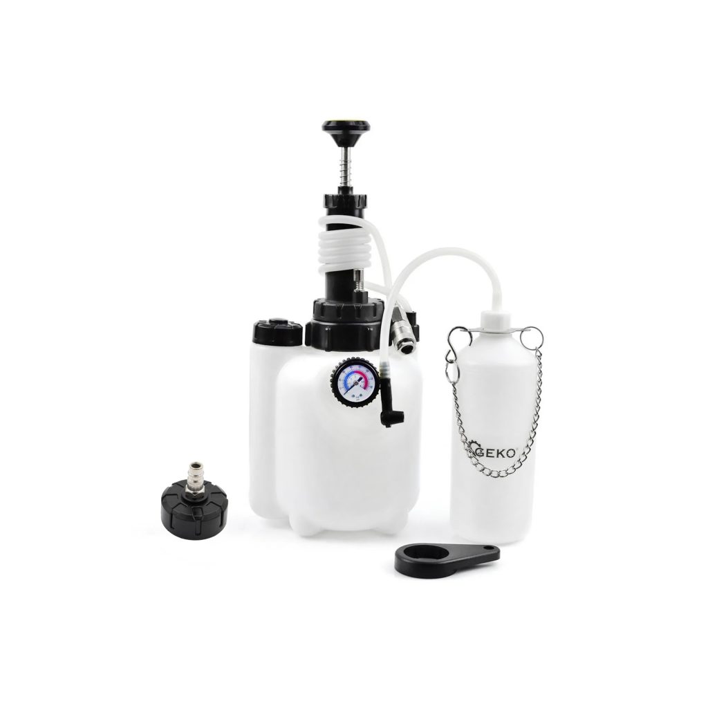 Ако в спирачната система има въздух, спирачната течност ще се овлажни и развали. Спирачният цилиндър на колелото ще бъде труден за връщане и може да доведе до повреда на спирачките. Затова спирачната течност трябва да се проверява и заменя навреме, за да се осигури добро спирачно представяне. Инструментът помпа новото спирачно масло в главния спирачен цилиндър, докато изтласква въздуха и старата течност от системата, без да произвежда въздух. Бързо и ефективно. Поддържаната спирачна система осигурява безопасност при шофиране. В комплекта са включени 2 броя адаптерни капачки за главен цилиндър с вътрешен диаметър 45mm, които са съвместими с повечето автомобили на Alfa Romeo, Audi, Bentley, BMW, Fiat, Land Rover, Lamborghini, Mercedes, Mini Cooper, Porsche, Renault, Volvo, Volkswagen, Bugatti, Chevy, Chrysler, Ford, Toyota и ABS системи. Повечето автомобили се нуждаят от 2L спирачна течност за оптимална замяна на маслото, този резервоар може да побере 3L. Изисква се само 10-15psi по време на прехвърлянето на течността (MAX W.P.: 2 bar / 30 PSI). Справете се с инструкциите на автомобила за подготовка, добавете правилното количество спирачна течност в резервоара за презареждане и го свържете с главния цилиндър, сглобете комплекта за изхвърляне на масло и го свържете с цилиндъра на колелото, след което помпайте. Повторете за всички цилиндри на колелата.
