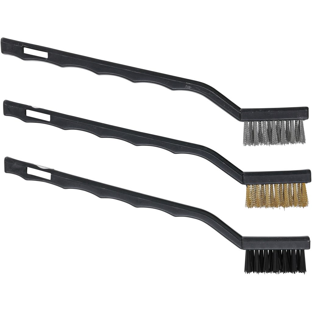 Този комплект четки с 3 части е проектиран за разнообразие от приложения за почистване и поддръжка, предлагащ практична комбинация от медни, найлонови и стоманени влакна. Четките разполагат с ергономични черни пластмасови дръжки за удобно използване по време на продължителни задачи.
