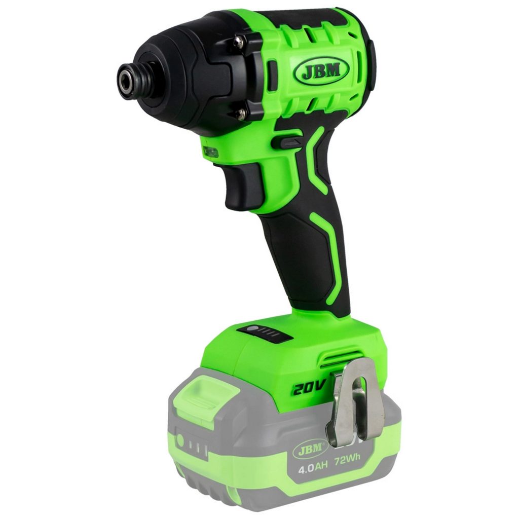 Безчетковият ударен шофьор е проектиран да завива винтове и да стяга гайки бързо, особено при работа с дълги крепежни елементи и здрави материали. Оснащен е с LED работна светлина за подобряване на точността при работа, 1/4“ хекс бързозаменяем патронник за бързо поставяне и сваляне на битове, и спусък, който може да бъде заключен, за да се предотврати случайното стартиране на инструмента. Батерията не е включена.