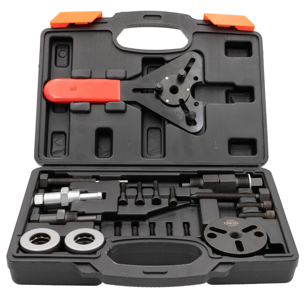 С него лесно се сваля и монтира диска на съединителя на компресора на климатика. Изработен от неръждаема стомана с черно покритие за здравина и дълготрайност. При правилна поддръжка и смазване, устоява на ръжда и корозия. Повреда на компонентите може да бъде избегната с помощта на комплекта за сглобяване на компресора на климатика.