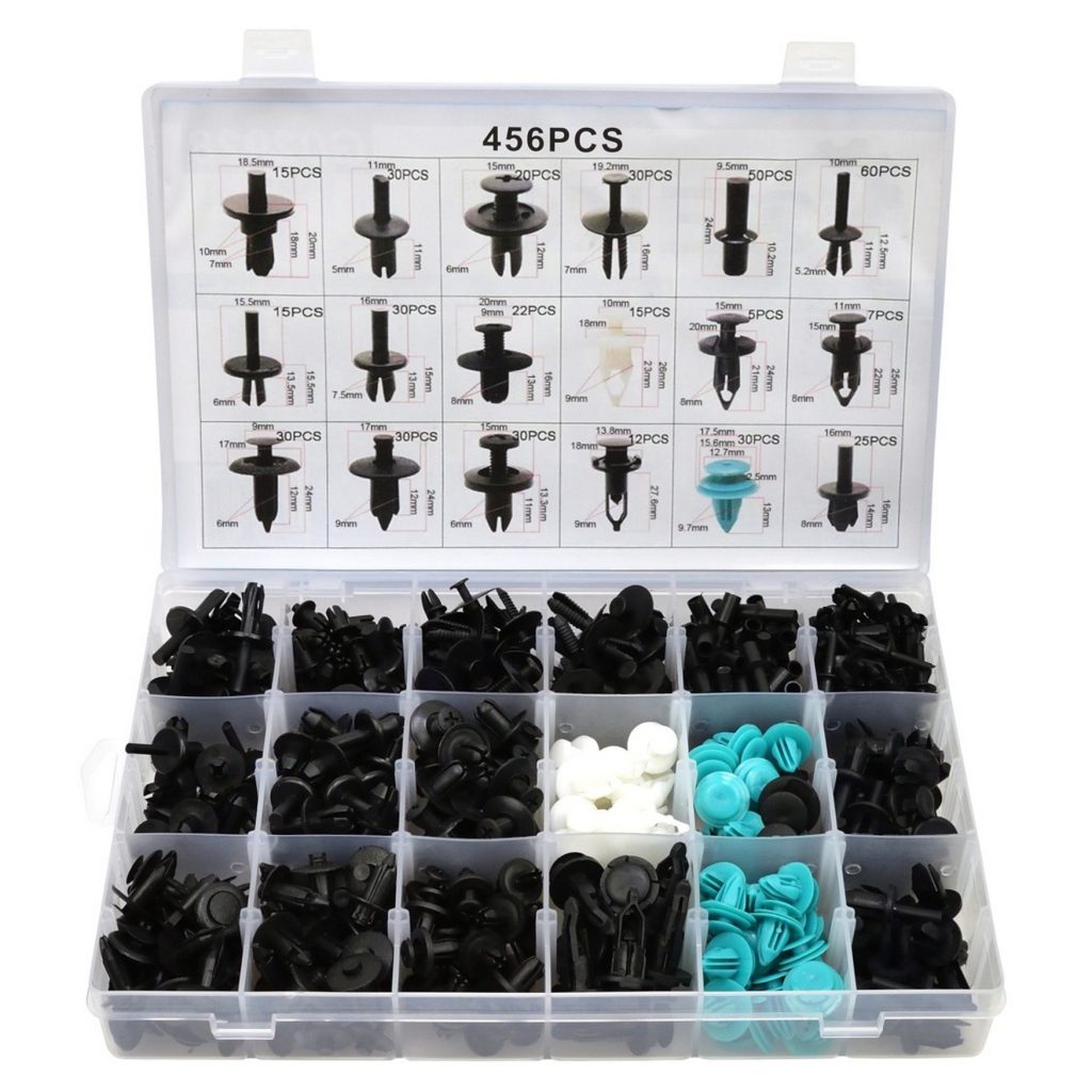 Комплект за натискащи нитове за панели и тапицерия на автомобили, 456бр.. Заменя оригиналните нитове на автомобила. 18 различни типа клипове, подходящи за повечето видове автомобили. Може да се използва за закрепване на броня, калници, интериорни облицовки, тапицерия и други аксесоари.