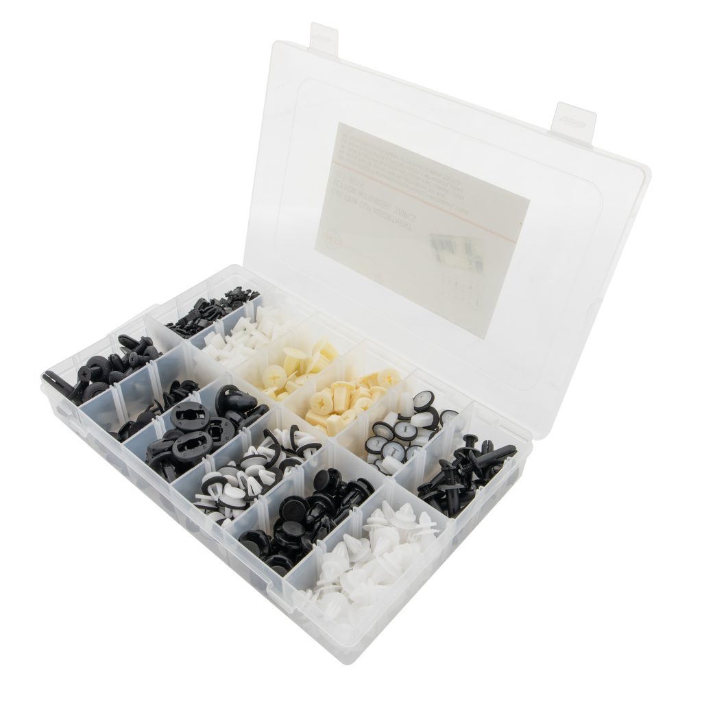 • OEM-съвместими крепежи – Включва 12 често използвани типа клипсове