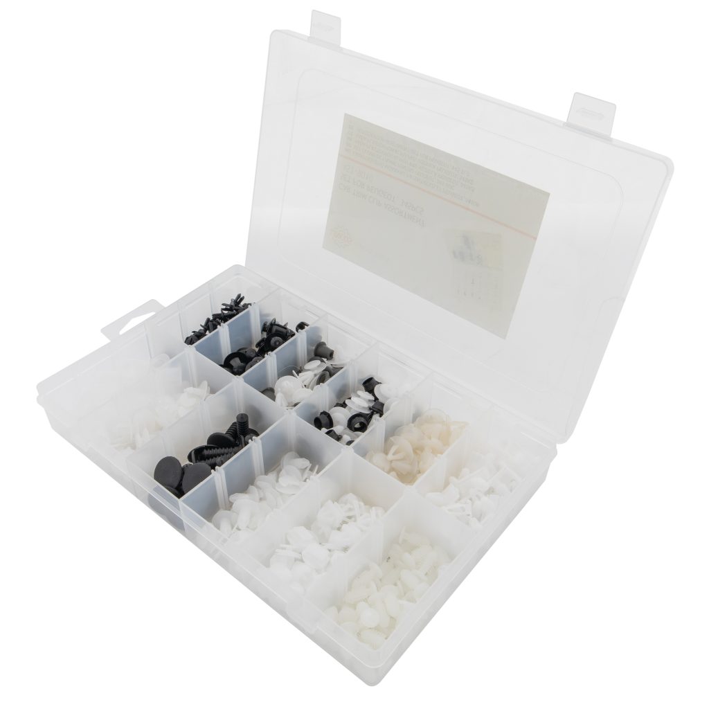 Този комплект от 345 части за клипсове за обшивка е проектиран за автомобили Peugeot и Citroën, предоставяйки широк избор от основни крепежни елементи за вътрешни и външни компоненти на обшивката. Тези OEM заместителни клипсове осигуряват сигурно и фабрично качество на монтажа за панели, облицовки, брони и обшивки на врати. Комплектът включва дванадесет различни типа клипсове, покриващи често срещани крепежи като клипсове с натискане, фиксатори тип „елха“, заклепки и задържащи елементи за панели.