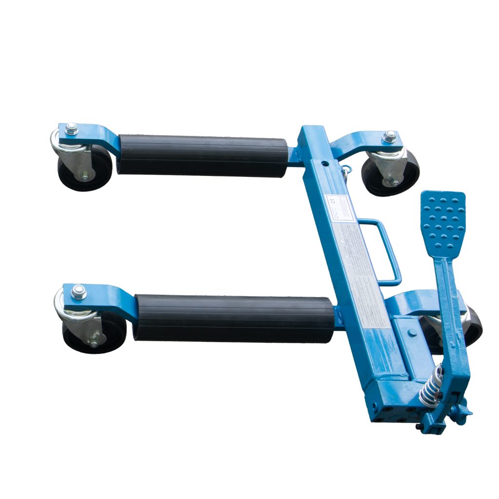 Тази механична количка за автомобилни колела е проектирана да премества превозни средства със заклинили или не въртящи се колела, като повдига колелото само на няколко сантиметра от земята. Количката се поставя директно под колелото и се управлява чрез механичен педал, повдигайки го сигурно без нужда от крикове или подемници.