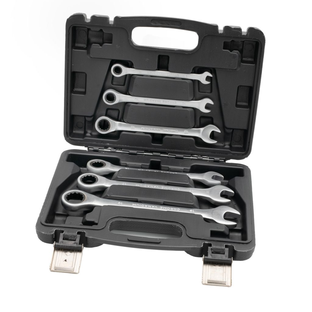 Комплектът се състои от 6 ръчни ключа с тресчотка, които ще улеснят работата дори на труднодостъпни места. Инструментите са изработени от издръжлива и устойчива хром-ванадиева стомана. Те могат да се съхраняват и транспортират безопасно в здрав пластмасов куфар, който е включен в комплекта.