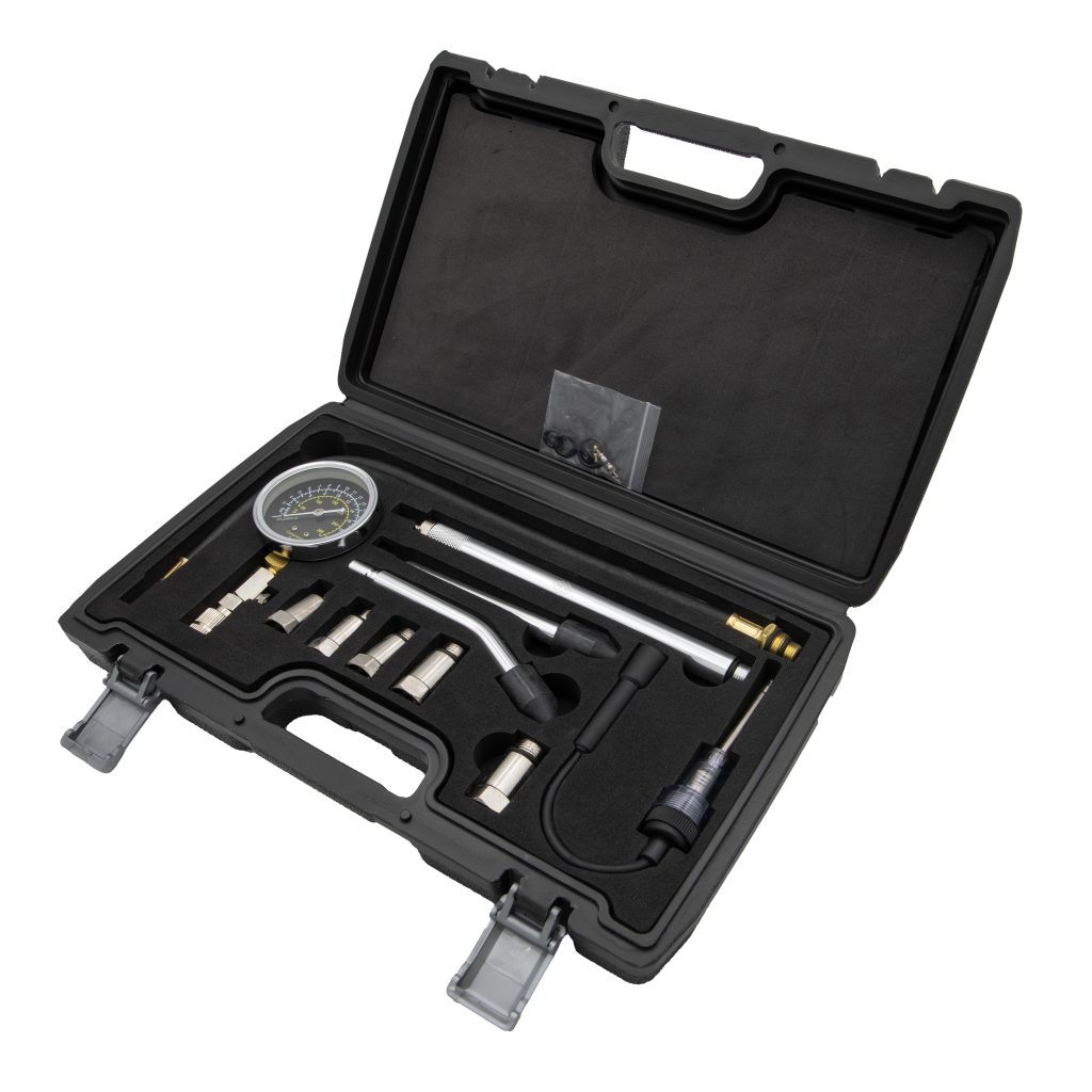 Комплект за тестване на компресия на бензинови двигатели ни позволява да определим производителността на двигателя и да идентифицираме проблеми с буталата, като ниска компресия или проблеми с уплътнението. По време на инспекцията, манометърът измерва налягането в горивната камера и чрез сравняване на резултатите от измерването може да се определи дали буталата работят правилно.