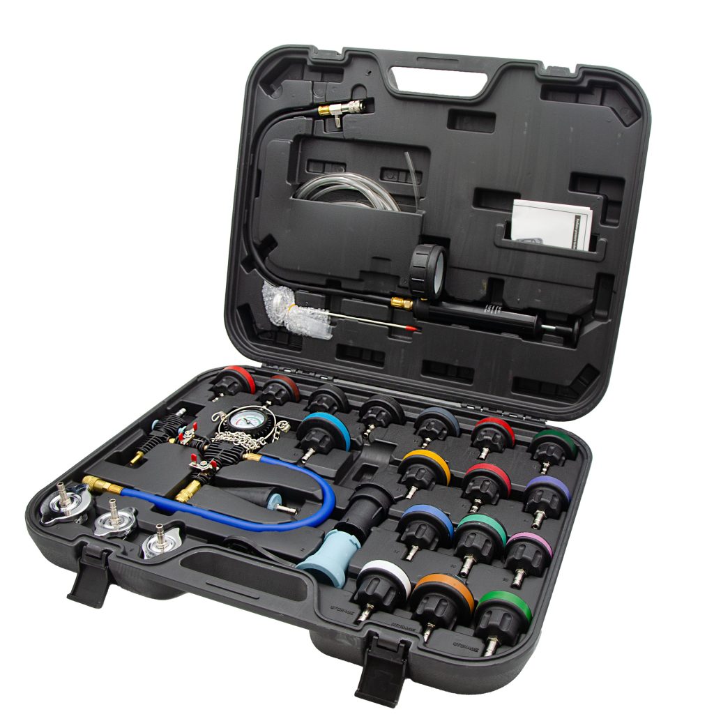 • Kit contains 27 pieces of equipment including 22 different test caps, a vacuum pump, pressure pump, cone adapter, and air bleeding/coolant hoses