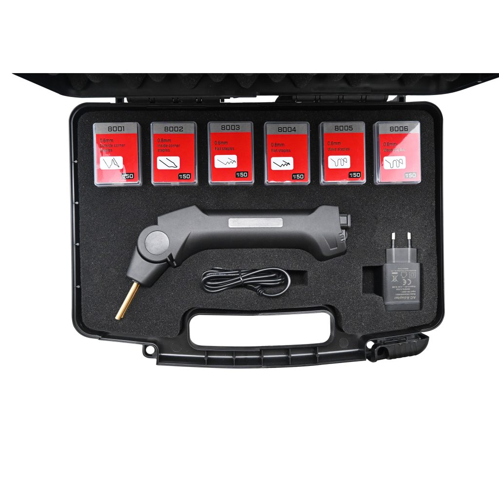 Прави подсилването на пластмасови части бързо и икономически ефективно. Ще можете да укрепите практически всякакъв тип термопластичен ремонт, от вътрешни и външни ъгли до тесни монтажни табове. За работа, просто поставете скоба в месинговите контакти и след това натиснете бутона. Докато държите бутона, натиснете горещата скоба в пластмасата, за да подсилите повредената зона. Освободете бутона и внимателно завъртете скобата с няколко градуса. Дръжте за няколко секунди, за да позволите на пластмасата да стегне, след което отстранете скобата, оставяйки скобата на място. Отрежете излагания проводник с диагонални резачки и шлайфайте гладко.