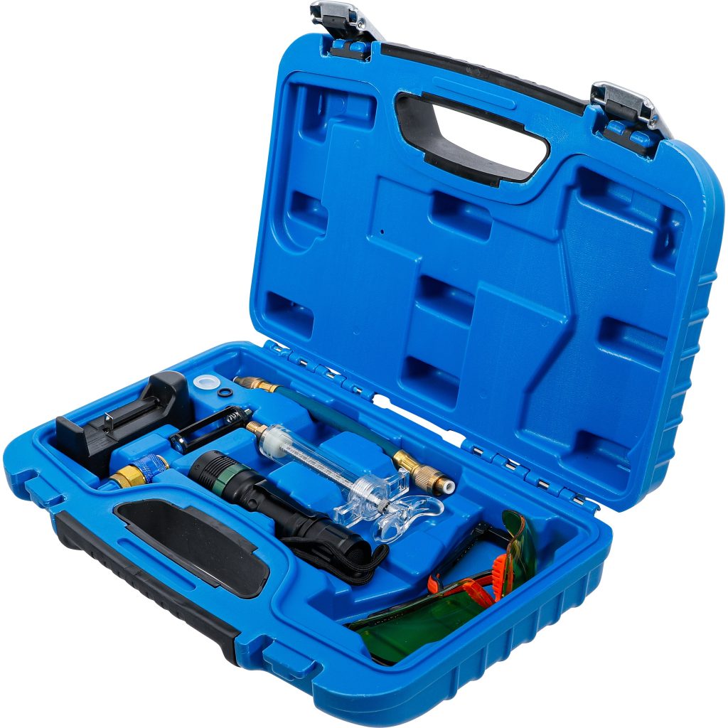 Комплект за безжично UV откриване на течове за климатични системи с R134a, включва UV лампа, защитни очила, батерия, зарядно устройство, спринцовка и накрайник за ниско налягане…