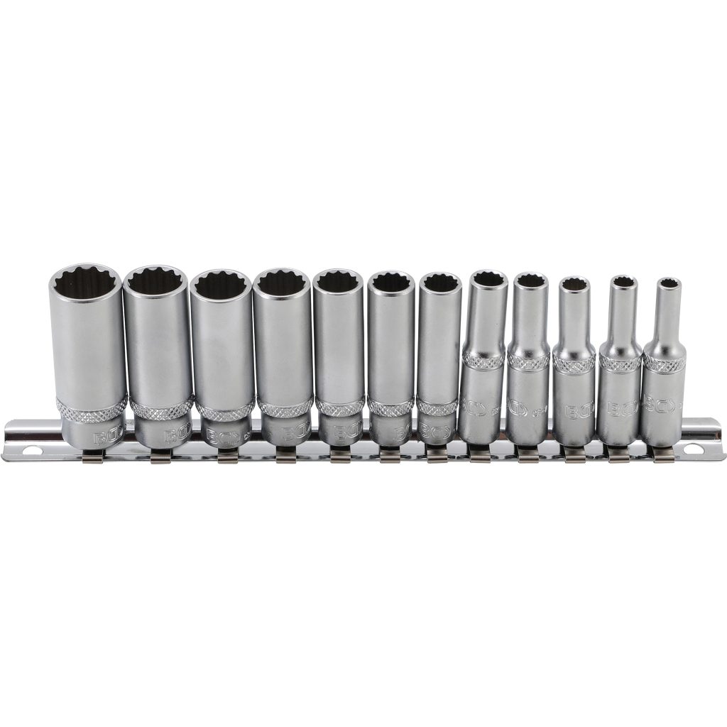 Този 12-частен комплект дълбоки вложки разполага с 12-точкови вложки за прецизна работа с инчови крепежни елементи, осигурявайки по-добър достъп в тесни или вдлъбнати пространства, където стандартните вложки може да не достигнат. Дълбокият профил позволява пълно захващане с дълги или изпъкнали болтове.