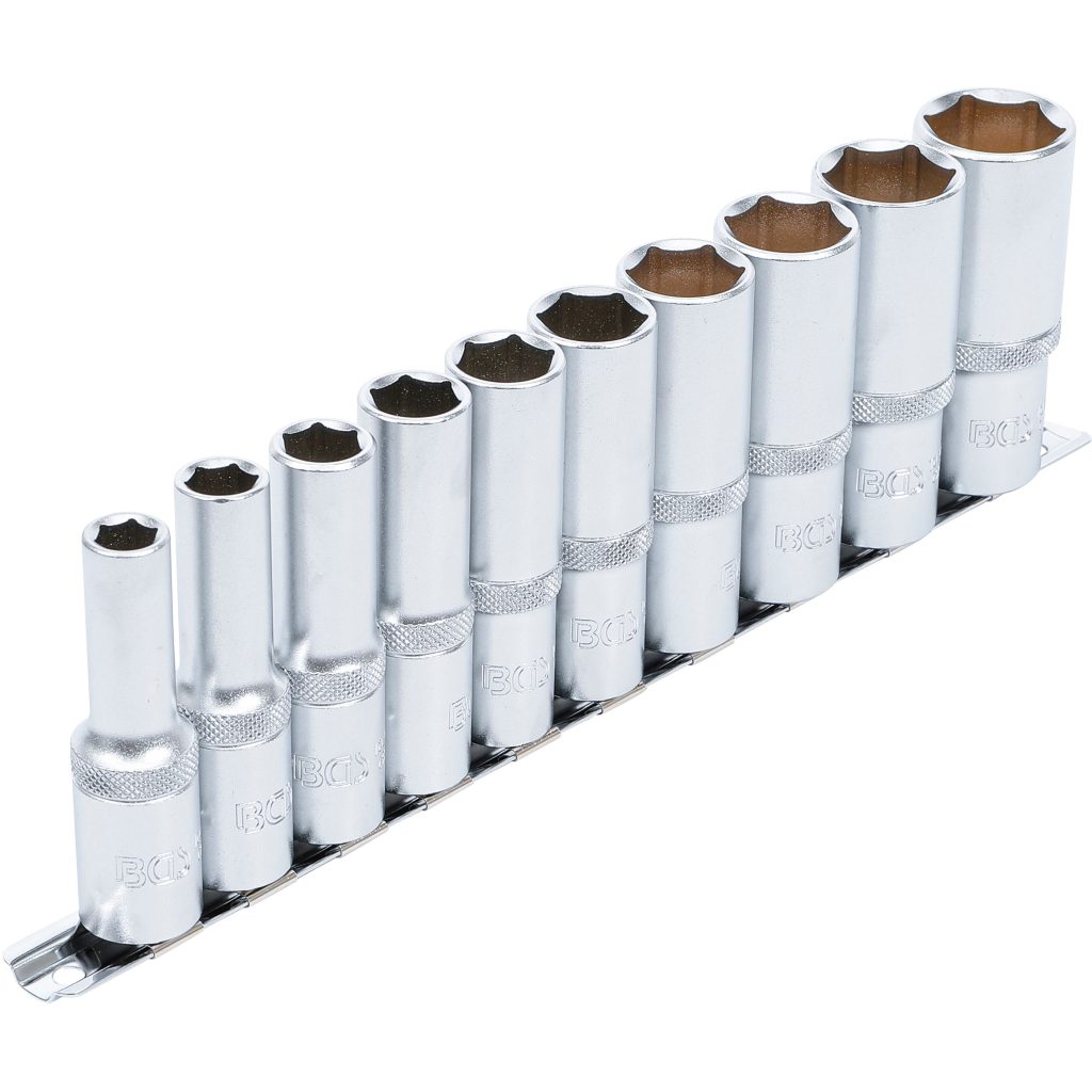 Този комплект от 10 дълбоки шестостенни вложки е проектиран за тежки задачи по затягане с болтове и гайки с инчови размери, често срещани в индустриални, механични или американски автомобилни приложения. Създаден с 12.5mm (1/2″) задвижване, тези Pro torque® вложки осигуряват издръжливост и капацитет за въртящ момент, необходими за взискателна работа.