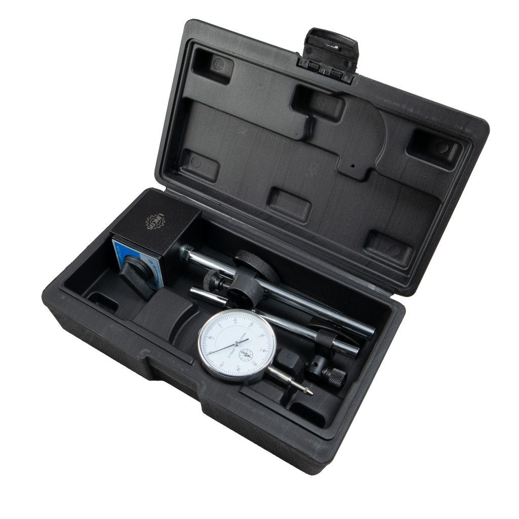 - Циферблатен индикатор: Разполага с метричен циферблатен индикатор с обхват 0-10 мм (0-1 инч), позволяващ прецизни измервания. Циферблатът е проектиран за ясна четимост и точни показания.