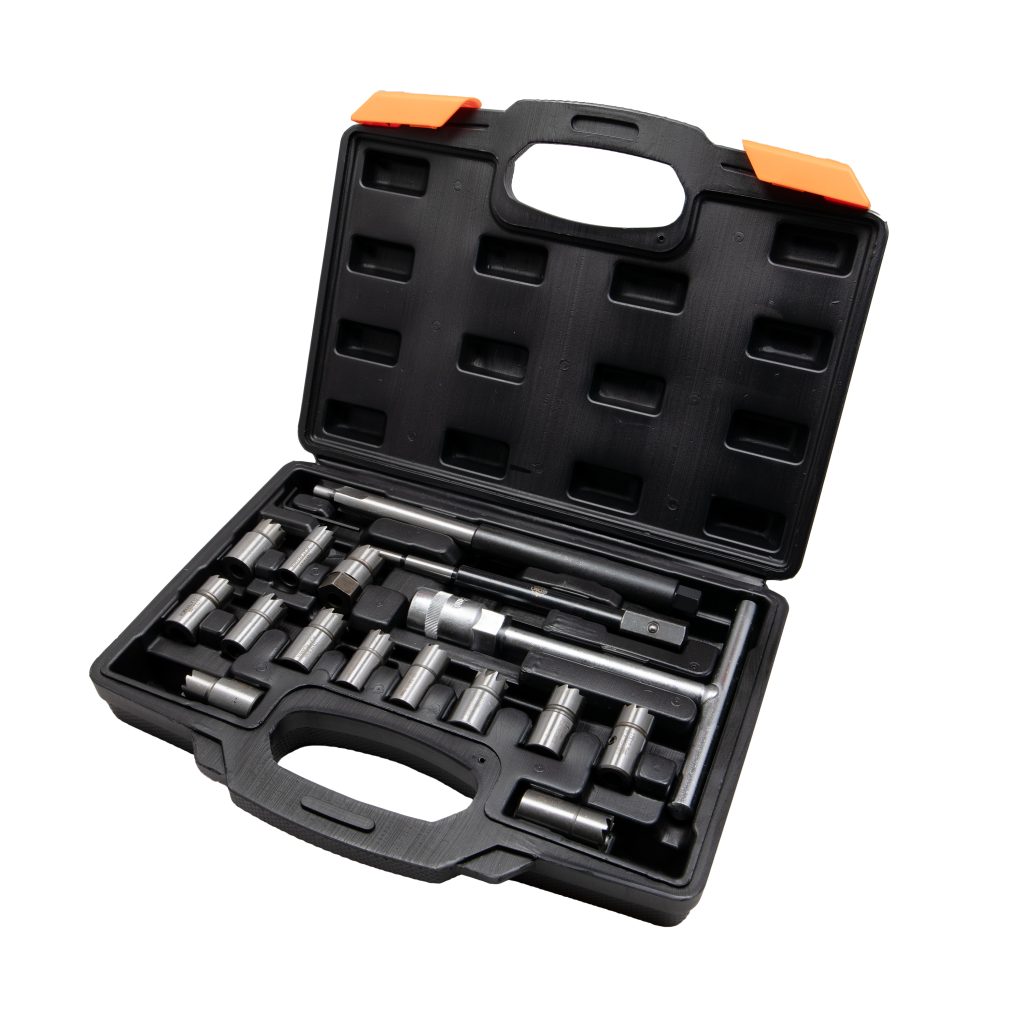 Комплектът за фрезоване на гнезда за инжекторни накрайници позволява на автомеханиците да почистват гнездата на инжекторните накрайници, да премахват отлагания и да ги възстановяват до правилната форма и размер. Комплектът включва набор от свредла и фрези в различни размери, за да паснат на гнездото на инжекторните накрайници.