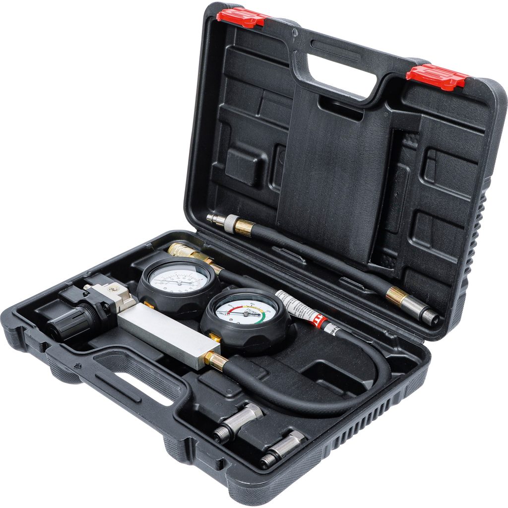 - Комплектът за тест на загуба на налягане в двигателя е професионален инструмент, проектиран да открива бързо и лесно течове в горивните камери на бензинови двигатели. Той идентифицира потенциални повреди, като течащи входни или изходни клапани, дефектни главни гарнитури или износени сегменти на буталата, показвайки падане на налягането в проценти.