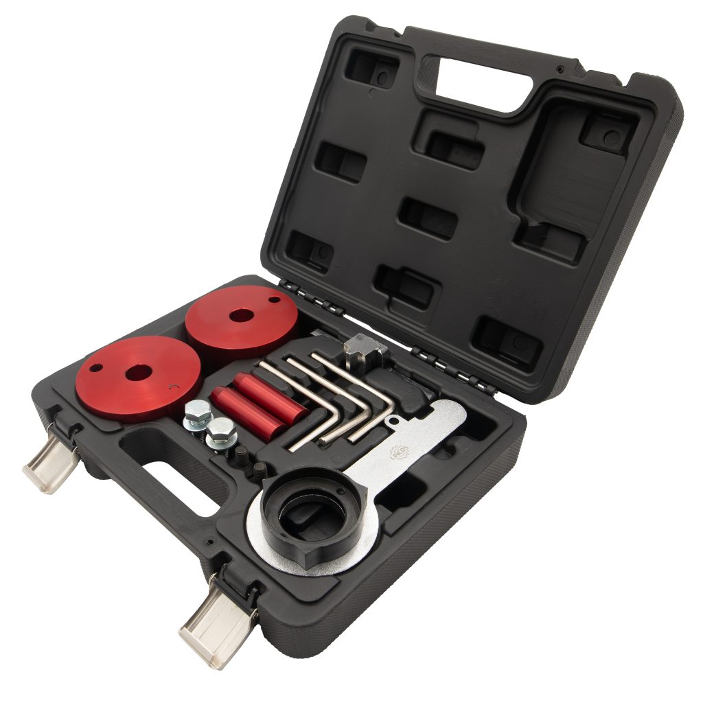 Специфичен дизайн за двигателя: Специално създаден за 2.0TDCi EcoBlue двигатели на Ford, комплектът съдържа инструменти, които се съобразяват с уникалните изисквания на тези двигатели, осигурявайки прецизност и точност при синхронизационни задачи.