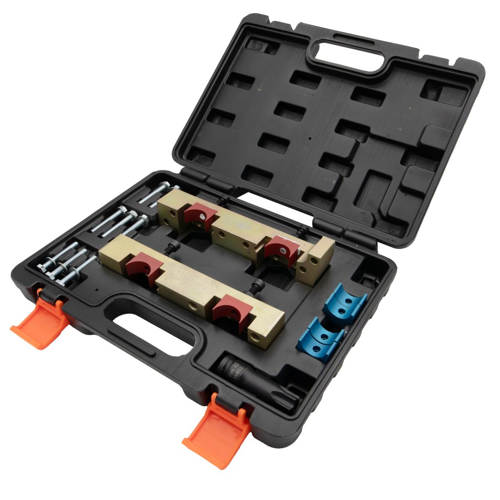 Комплектът включва специално проектирани инструменти с малки и големи скоби, които осигуряват сигурно и точно задържане на разпределителния вал по време на регулиране на времето или при работа с ангренажната верига на двигателя.