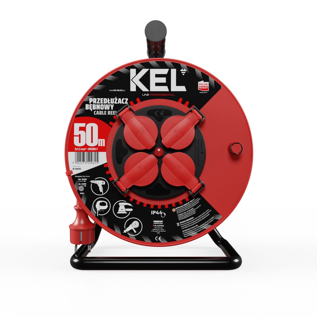 Удължителен кабел на макара с термозащитен прекъсвач и червен гумен кабел. Предназначен за използване в автосервизи и на строителни обекти. Дължина 50м.