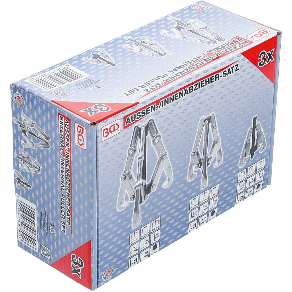 Комплектът за външно/вътрешно изтегляне с 2/3 рамена 100/120/150mm 3бр е универсален инструментариум, проектиран за изтегляне, разглобяване и отстраняване на пресовани части, като зъбни колела, лагери, шайби и втулки. Комплектът включва както изтеглячи с 2 рамена, така и с 3 рамена, което го прави подходящ за различни операции по изтегляне, независимо дали от вътрешната или външната страна на компонента.