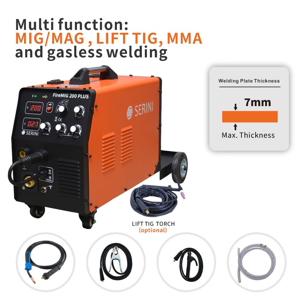 Инверторната заваръчна машина FireMIG 200 PLUS IGBT е проектирана за универсална работа с различни заваръчни техники, включително MIG/MAG, Lift TIG, MMA и безгазово заваряване. Захранвана от 230V/50Hz/1ph, тя използва съвременна IGBT инверторна технология за стабилно и ефективно заваряване.