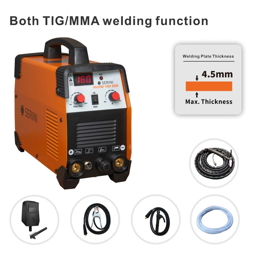 Машината за заваряване FireTIG 160 ECO DC е универсален инструмент, предназначен както за TIG (волфрамова инертна газова) заварка, така и за MMA (ръчна метална дъгова) заварка. Тази двойна функционалност я прави идеална за различни заваръчни задачи, независимо дали работите с въглеродна стомана в режим MMA или неръждаема стомана в режим TIG. Машината поддържа заваряване на плочи с дебелина до 4.5 мм, осигурявайки здрави и надеждни съединения в различни приложения.