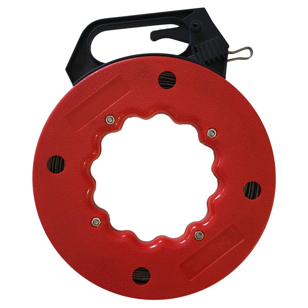 15м стоманен кабел за риболов в пластмасов червен калъф. Плоска метална лента, размер 3x1мм. Размер на главата за вмъкване 40x10x3мм.