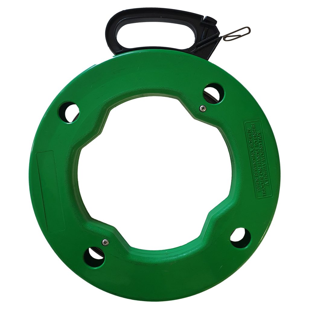 30м стоманен кабел за риболов в пластмасов зелен калъф. Плоска метална лента, размер 3x1мм. Размер на главата за вкарване 40x10x3мм.