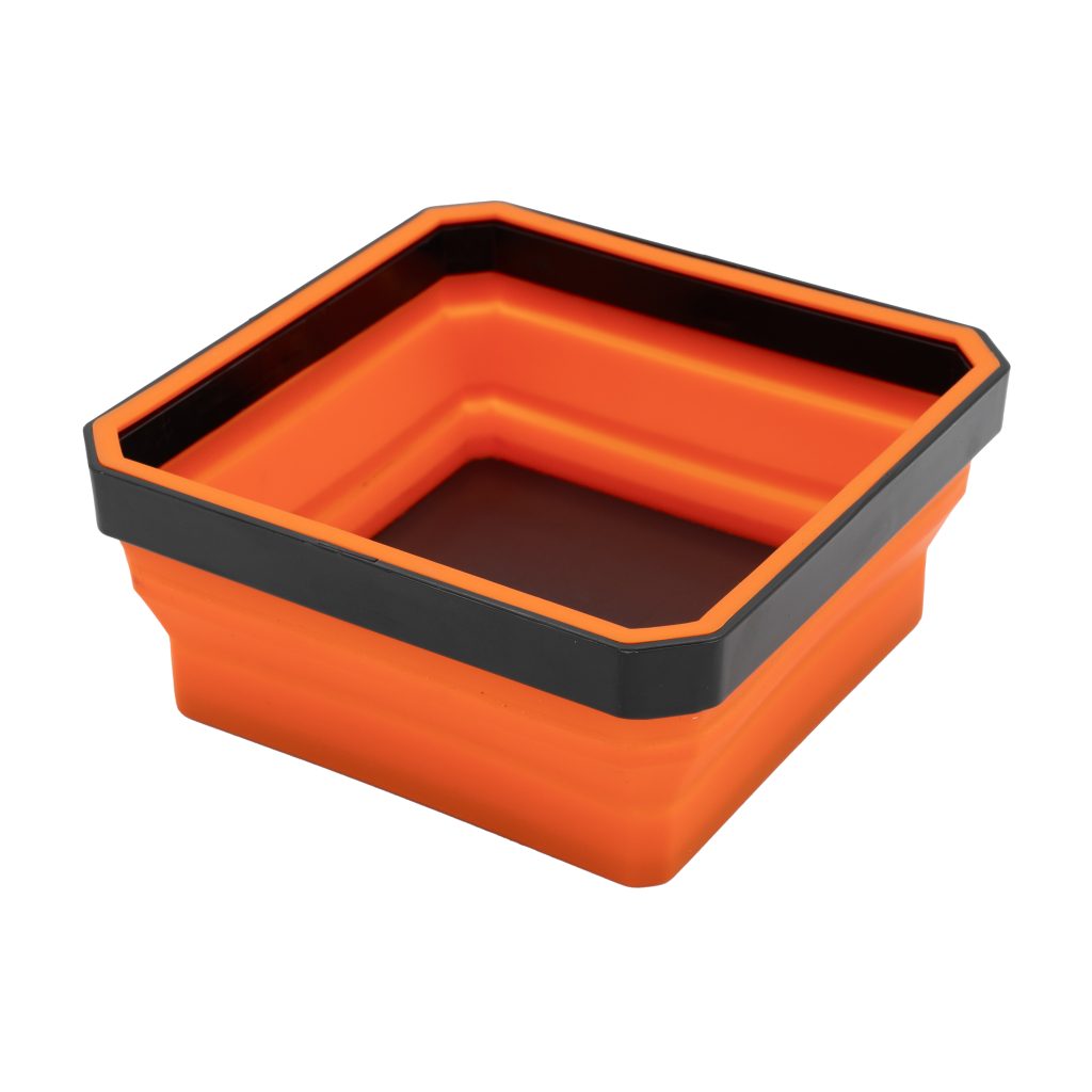 Нашата сгъваема тава има основа с мощни магнити, които осигуряват стабилно задържане на повечето метални повърхности, докато държат метални части и инструменти на място. Всички магнитни купи са устойчиви на повечето вредни течности. Те са изработени от силикон с висока якост, така че можете да бъдете сигурни, че ако я закупите, ще се насладите на положителните ползи за много дълго време.