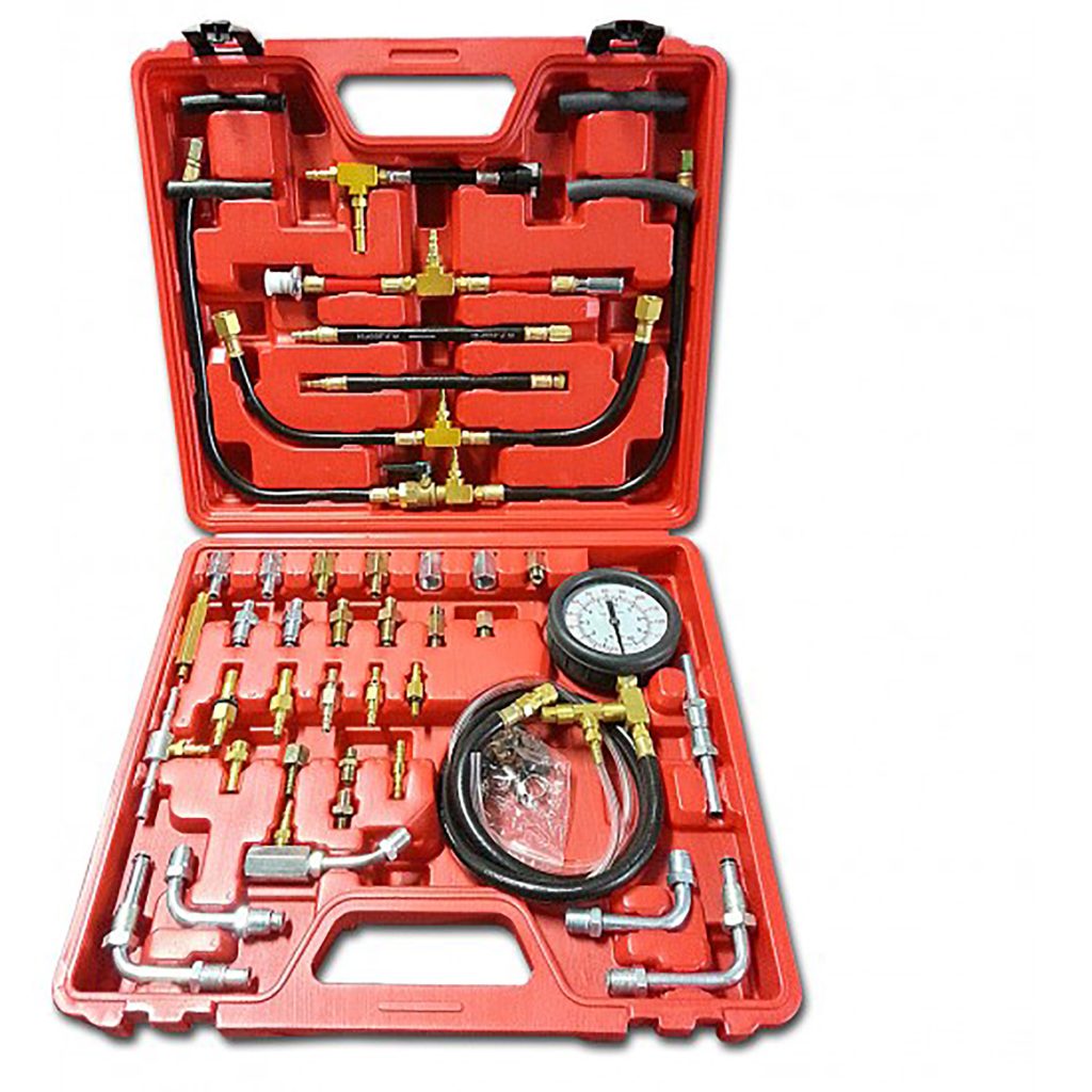 Тестер за налягане на инжектори за бензинови двигатели. Състои се от два манометъра с диапазони в MPa, BAR-PSI. Маркучите са устойчиви на бензин, гъвкави с вентилиращи топки. Комплектът съдържа и няколко адаптера, които са съвместими с повечето европейски, американски и японски автомобили. Изработен е за системи с едноточково впръскване на гориво. Всички адаптери на системата за тестване на инжектори са оборудвани с бързи съединители за бързо и ефективно тестване на инжекционни системи. Целият комплект е поставен в пластмасов калъф, който улеснява съхранението и транспортирането. Работен диапазон 0-10bar.