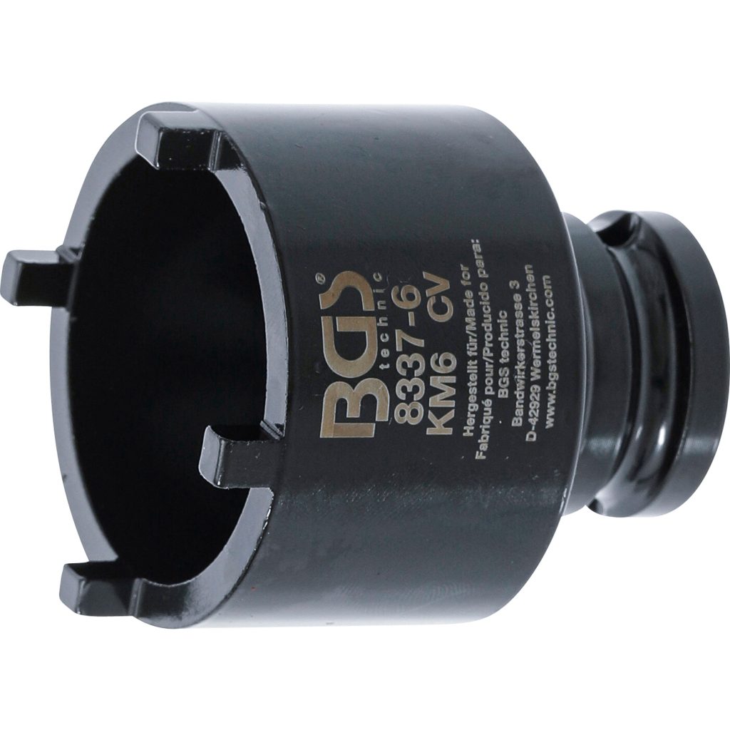 Изработен от хром-ванадиева стомана, той предлага отлична устойчивост на износване и здравина. Разполага с вътрешен квадратен накрайник 12.5mm (1/2″) и 4 стержена, осигурявайки стабилно и точно прилягане за гайки KM6 с прорези.