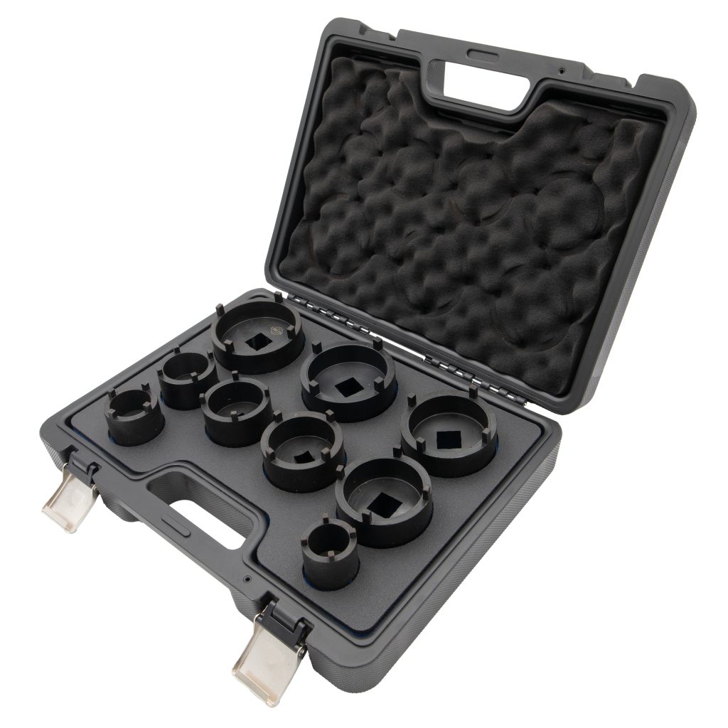 Комплектът гнездови ключове за жлебови гайки с външни резби (9 части) е предназначен за лесно развиване и завиване на жлебови гайки. Идеален за използване върху валове, затягащи втулки или изтеглящи втулки, този професионален комплект осигурява сигурно и ефективно манипулиране на жлебови задържащи гайки.