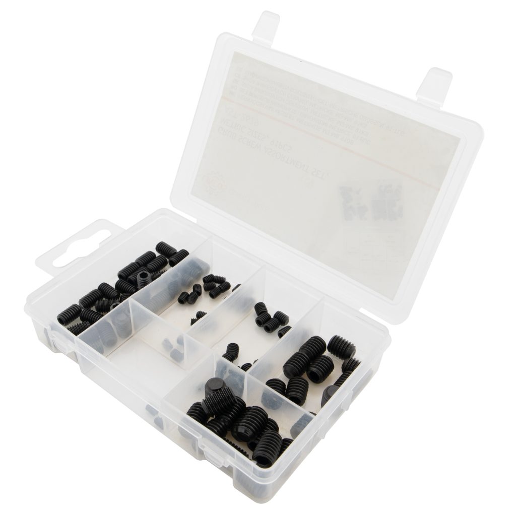 Този комплект от 91 броя винтове с плосък край е изработен от висококачествена стомана и отговаря на стандартите DIN 913 за винтове с плосък край.
