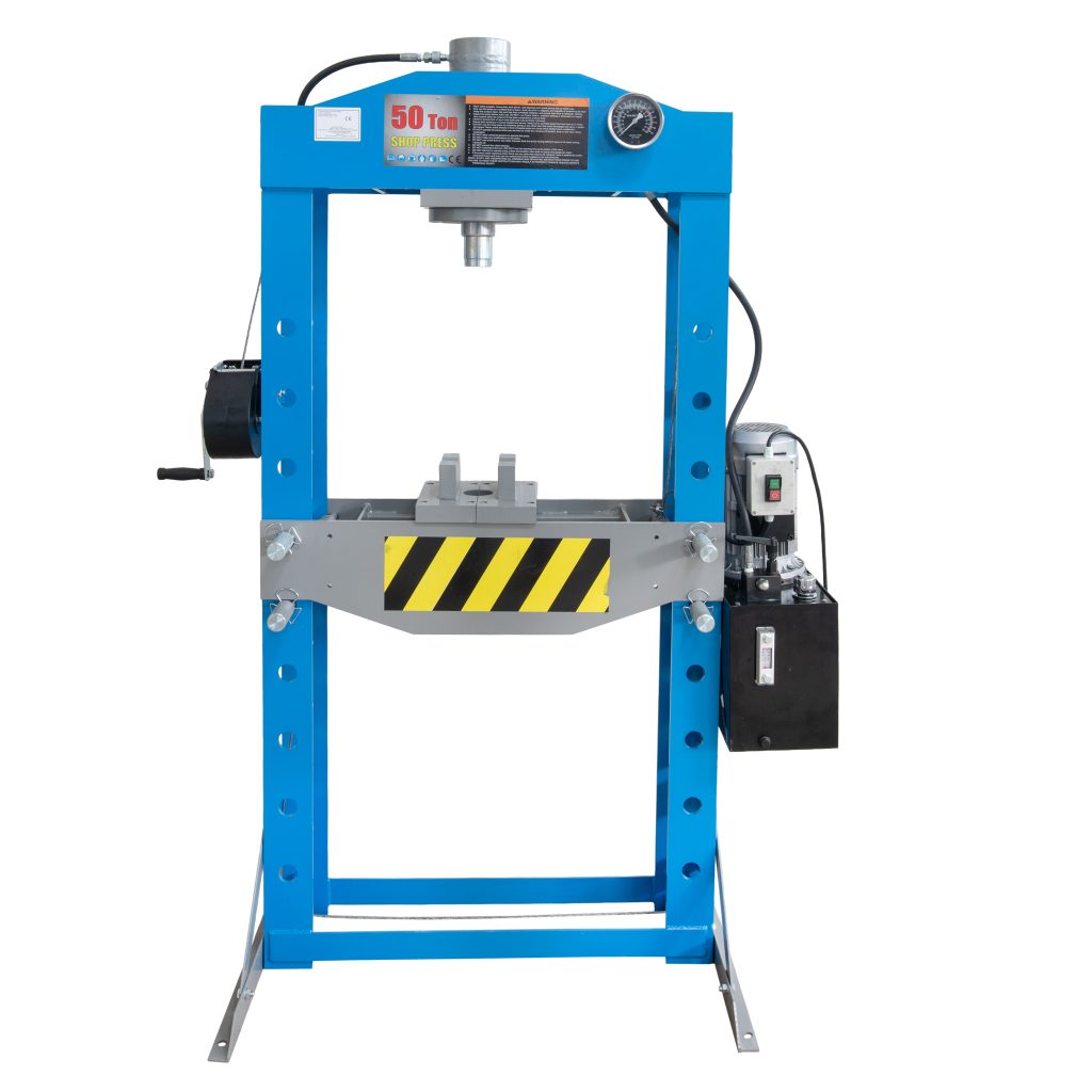 Тази 50-тонна тежкотоварна електрическа/хидравлична преса за сервиз е високопроизводителен индустриален инструмент, предназначен за пресоване, огъване, изправяне и монтаж/демонтаж на компоненти в механични, селскостопански и тежкотоварни сервизи за ремонт на превозни средства.
