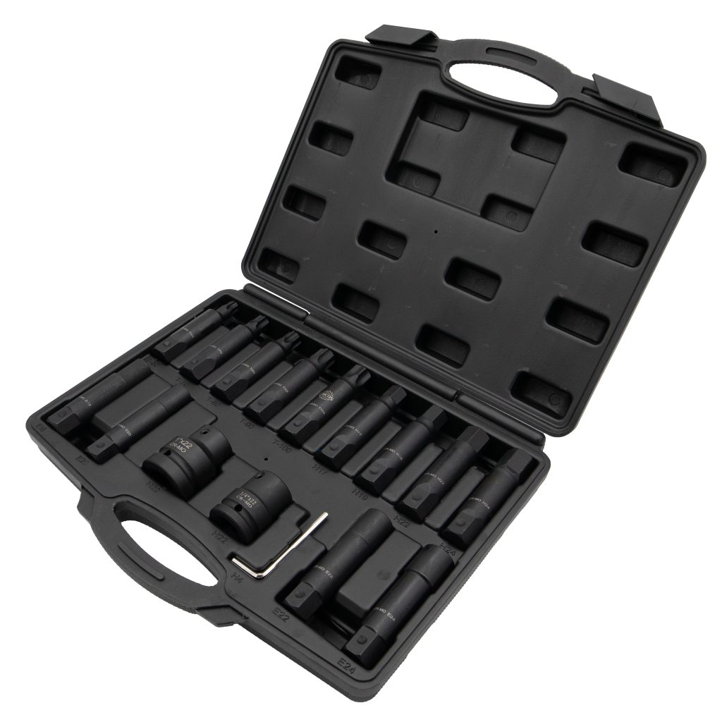 Комплектът включва широк диапазон от ударни Torx глави (T60–T100), Hex глави (H17–H24) и ударни накрайници E-профил (E18–E24). Включени са също два адаптера за съвместимост с инструменти с 3/4″ и 1″ задвижване, както и шестограм 4mm за закрепване на винтове.