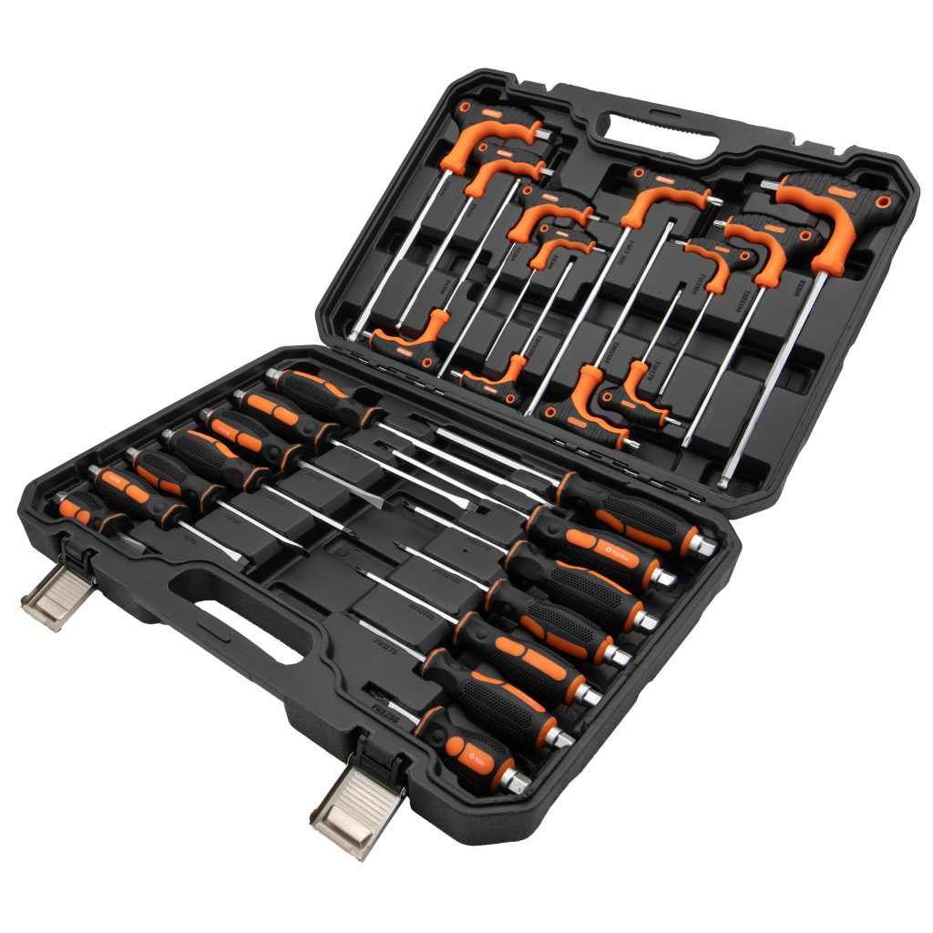Този 26-частов комплект отвертки от висок клас предлага пълен набор за прецизни и тежки задачи по затягане. С асортимент от плоски, кръстати, Pozidriv, шестостенни и Torx отвертки, той е идеален за механични, електрически и общи приложения.
