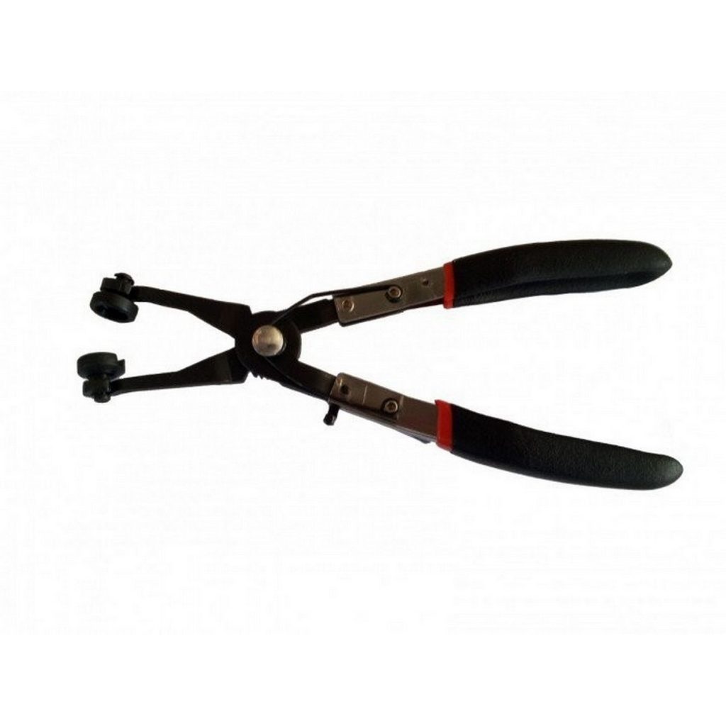 Този инструмент улеснява свалянето и поставянето на скоби за маркучи. Разполага с механизъм за заключване с рachet, който позволява лесна употреба на скобите, разположени дълбоко в двигателя. Въртящите се челюсти позволяват правилното захващане на големи и малки скоби под всякакъв ъгъл.