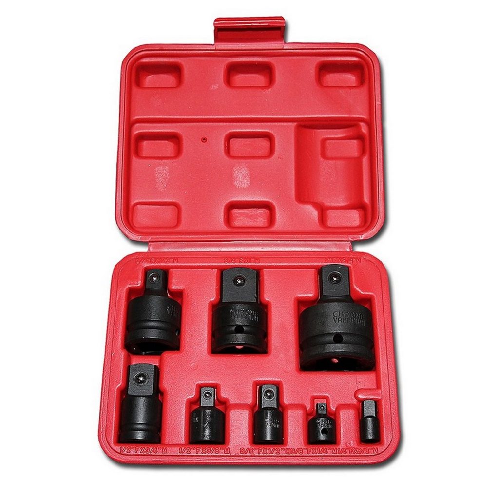 Комплект адаптери за накрайници с ударно задвижване. Проектиран за ключове, гайковерти и ръчни инструменти. Може да се използва с пневматични инструменти, електрически инструменти или инструменти за задвижване. Спирачка с пружинен механизъм може да заключи накрайника на място и да фиксира проходния отвор, за да предотврати падането му, осигурявайки отлична стабилност и изпълнение. Тези накрайници за ударен гайковерт са изработени от висококачествена корозионноустойчива стомана, което ги прави издръжливи и дълготрайни.