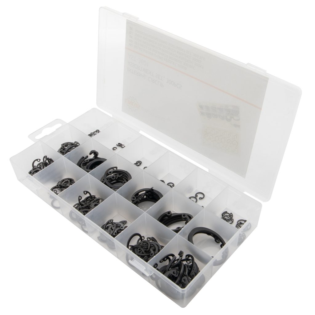 Този 300-частен комплект за вътрешни стопорни пръстени е незаменим за механични, индустриални и автомобилни приложения, осигурявайки сигурно и надеждно закрепване вътре в обработени канали в отвори или корпуси.