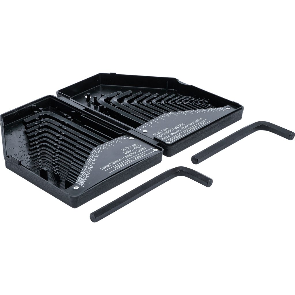 Комплект L-ключове с 30 части с вътрешен шестостенен профил. Метрични и инчови размери. Хром-ванадиева стомана.